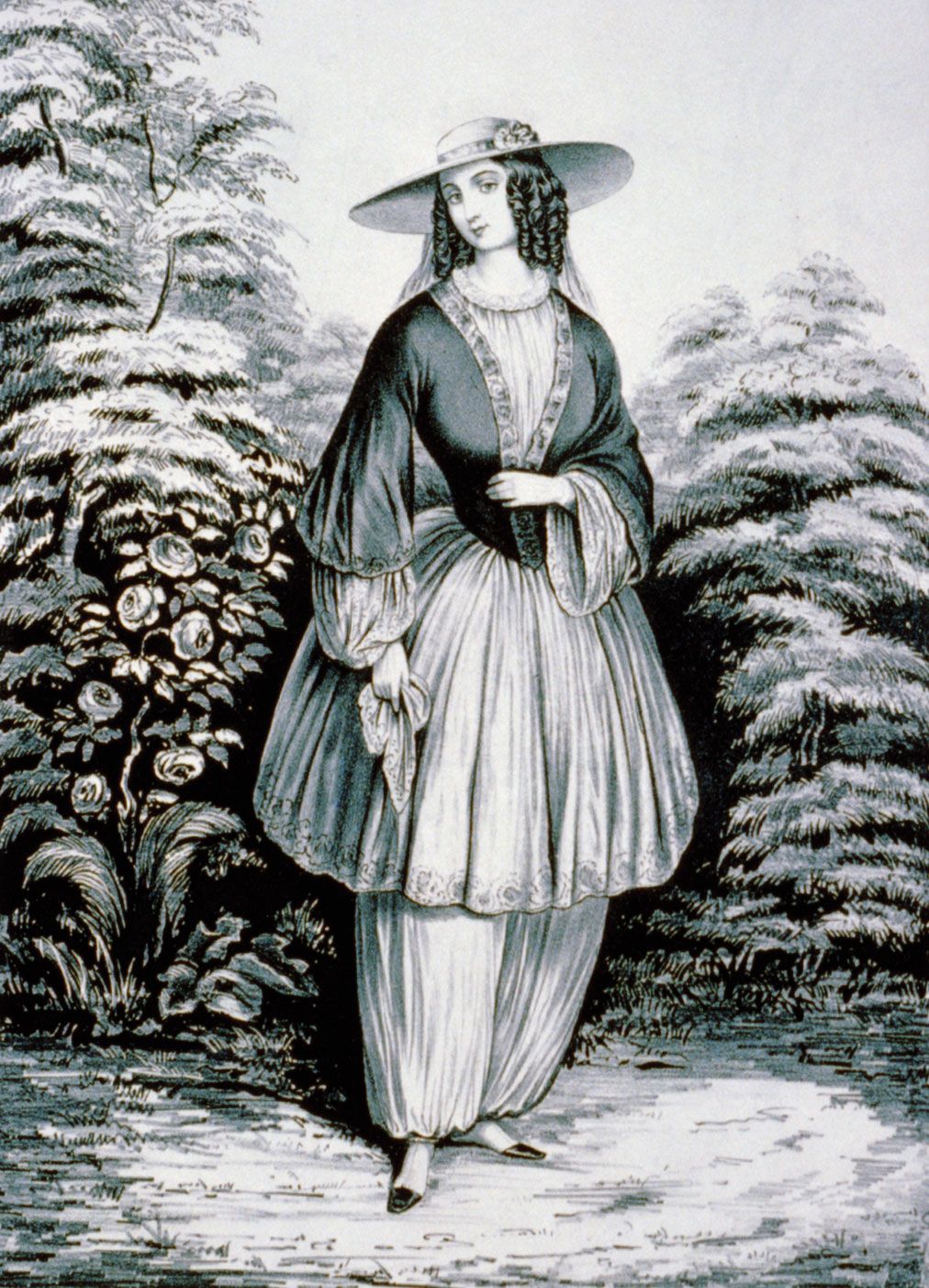 In 1848, as women throughout the United States sought greater participation in government with the Seneca Falls Convention, figures and voices that had been previously marginalized made their way into public consciousness. Amelia Bloomer, an attendee of the convention, made her and other women’s voices known one year later with The Lily, a newspaper for women’s rights and temperance issues. By 1853 Bloomer had become an outspoken advocate for women’s rights, especially when it came to clothing conventions and dress reform. Bloomer found that the corsets and dresses women her age were expected to wear were too restrictive and potentially dangerous, so she began sporting in public something looser and more comfortable under her skirt: full-cut pantaloons. Although other women before Bloomer had worn the pantaloons, Bloomer’s outspoken advocacy for the garments in The Lily made her their new namesake, bloomers.